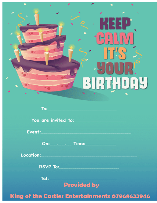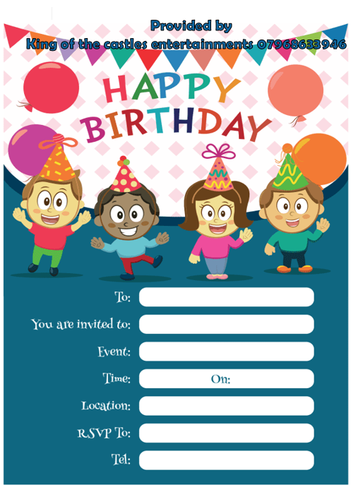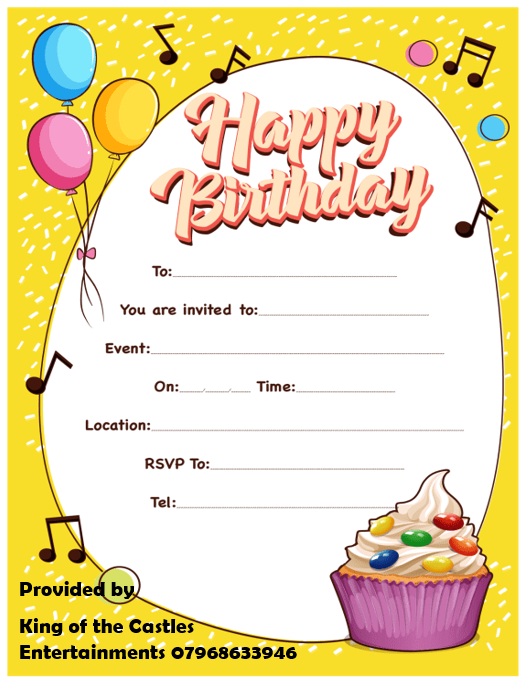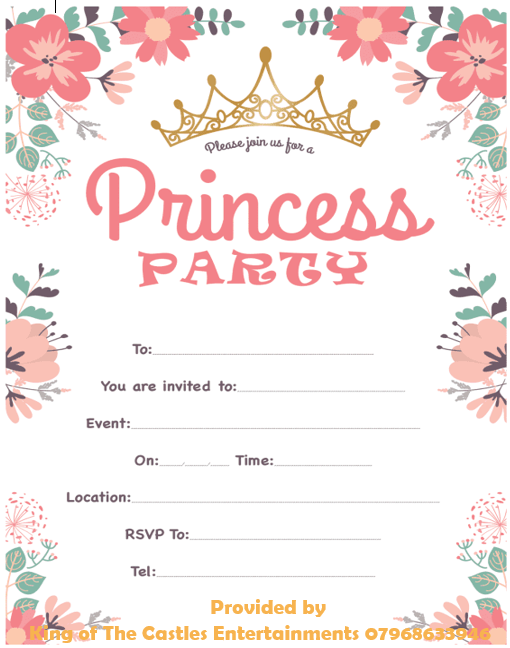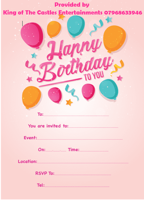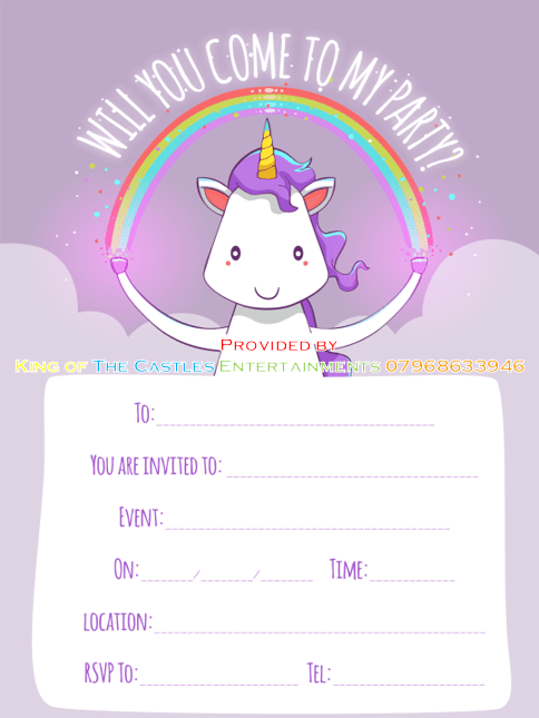 Why not download our free invitations for your party here are some themes that go with this castle you can download these whether you book with us or not! Here are the choices we have, please click on the link and it will provide two A5 Party Invites!